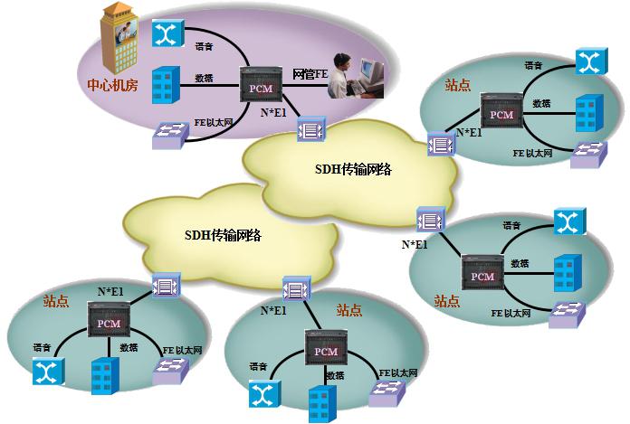 - PCM設(shè)備主要以E1鏈路作為承載通道,與SDH網(wǎng)絡(luò)之間通過多E1捆綁的方式,將業(yè)務傳輸至SDH網(wǎng)絡(luò),并實現(xiàn)全網(wǎng)業(yè)務最終匯接至中心機房